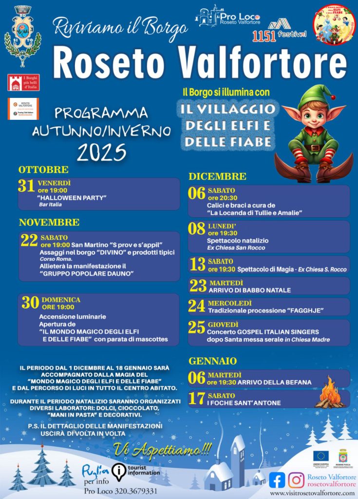 Dal 31 ottobre 2025 al 18 gennaio 2026, il paese si animerà con un fitto calendario di eventi, spettacoli e tradizioni che culmineranno con il ritorno del suggestivo “Villaggio degli Elfi e delle Fiabe”, un’esperienza unica che negli ultimi anni ha conquistato famiglie, turisti e appassionati di magia natalizia.